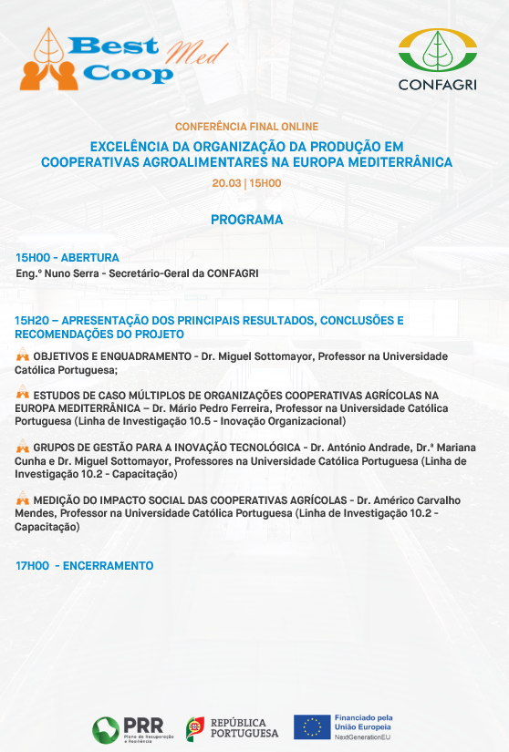 No próximo dia 20 de março, às 15h00, irá realizar-se, em formato online, a Conferência Final do Projeto BestCoopMed – Excelência da Organização da Produção em Cooperativas Agroalimentares na Europa Mediterrânica.