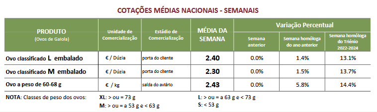 O Ovo a peso de 60-68 g atingiu um preço de 2.43 € / kg na presente semana. Ficou 6% acima do preço do mesmo período do ano 2025 e igual ao período anterior.