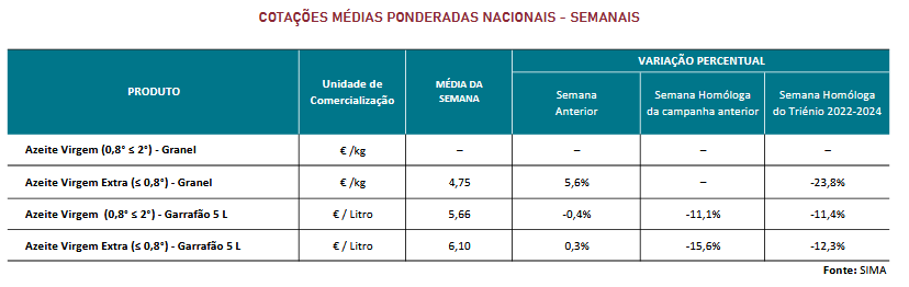Prosseguiu a campanha de comercialização de azeite 2025/2026 nas áreas de mercado do Alentejo, Ribatejo, Beira Litoral, Beira Interior e Trás-os-Montes com subida da cotação de azeite virgem extra a granel. Em Trás-os-Montes, verificou-se uma redução das quantidades de azeite transacionadas, associada à forte concorrência do azeite importado da Tunísia. Na Beira Litoral, apesar da diminuição da oferta, o escoamento do produto mantém-se equilibrado, com manutenção das cotações sustentada por uma procura alta. Em relação à qualidade, o azeite caracteriza-se como bom, em todas as regiões. De acordo com as últimas previsões do INE, perspetiva-se uma produção global semelhante à da campanha anterior, na ordem das 179 mil toneladas, contrariando as estimativas iniciais, possivelmente como resultado da entrada em produção de novos olivais, sobretudo em sistemas intensivos e superintensivos na região do Alentejo.